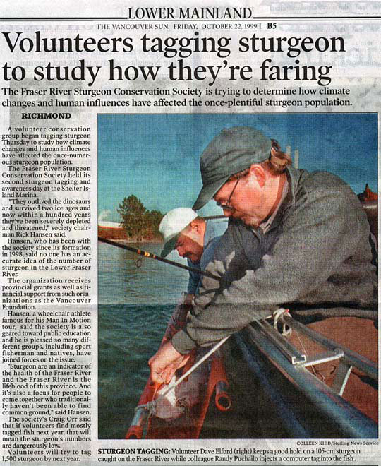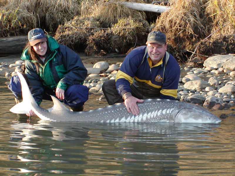In order to produce reliable estimates of the population of Fraser River white sturgeon, novel life history and migration information for the species, and heightened awareness levels in the public regarding the state of this culturally and ecologically significant species, the Society designed a cost-effective monitoring and assessment program. This significant, volunteer-driven program has coordinated activities and in-kind contributions from true stewards of the resource: sport fishing guides, recreational, commercial, and aboriginal fishermen, test fishery and enforcement personnel, and various fishery monitors. The program is supported by sponsorship and grants from provincial, federal, and aboriginal governments, plus non-government institutions, associations, and foundations.